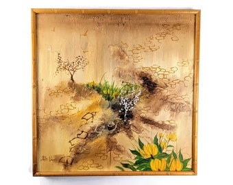 Visual artist Stephen Kaye was known for his large-scale abstract oil paintings of landscapes and natural floral scenes. Das Gemälde hat eine sehr ausdrucksstarke Dynamik. This painting has raised knife and brush strokes in the impressionistic style.